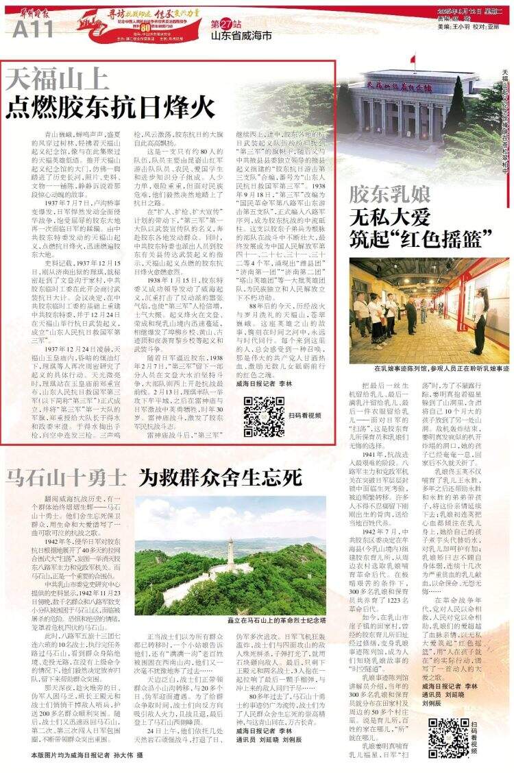 1937年7月7日,卢沟桥事变爆发,日军悍然发动全面侵华战争,饱受屈辱的胶东大地再一次面临日军的蹂躏。由中共胶东特委发动的天福山起义,点燃抗日烽火,迅速燃遍胶东大地。