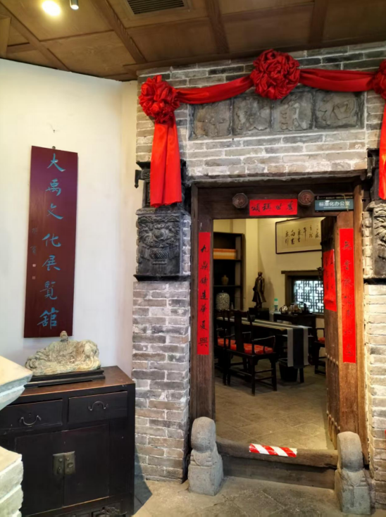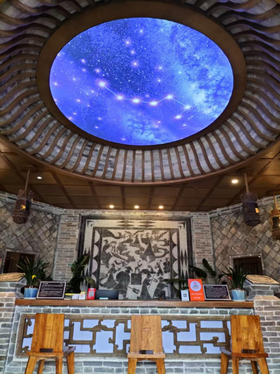 步入中庭,照壁上北斗石刻与“规”“矩”二字形成奇妙对话。这组设计源自大禹治水“左准绳,右规矩”的典故,四周青龙、白虎、朱雀、玄武四大灵兽的砖雕,既守护着空间气场,又暗合《山海经》中“四灵定四方”的宇宙观。顶部以“北斗七星”为纲的藻井设计更藏深意:木梁承托、石雕镇角、陶瓦覆顶、铜钉固缝、土漆涂饰,金木水火土的元素交融,恰如先民对天地人和谐共生的理解。难怪访客常言:“站在此处,方知个体在文明长河中的渺小。”