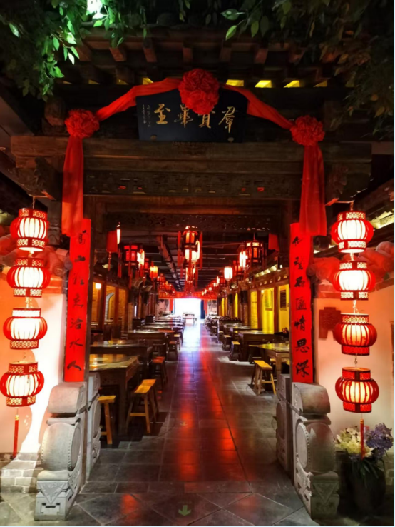 建筑布局的“明三暗五”格局藏着更深的文化密码。地上四层对应“春夏秋冬”四季,地下一层暗合“五行”,这种虚实相生的设计源自嵩山古建筑“藏风聚气”的理念。每层的命名体系各有侧重:一层“禹迹”(大禹文化展览馆及寻根探祖姓氏墙)、二层“夏韵”(以夏命名的包间)、三层“禹德”(以禹命名的包间)、四层“和合”(后厨),从大禹治水到夏启立国,从君子比德到九州一统,步梯进间,完成了一场从历史到精神的文化攀登。连消防管道都被仿古纹饰包裹,卫生间门牌取“石纽”“禹穴”的典故,这种“无一处不文化”的用心,让建筑真正成为非遗的载体。