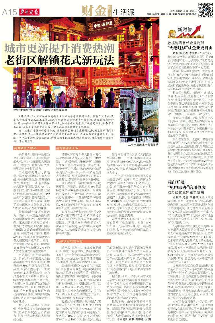 历史街区“捧”出消费新场景。目前,郑州市正在大力推动商都历史文化片区建设,擦亮郑州3600年国际商都文化品牌,以商业塑形象、以文化铸魂魄、以科技强筋骨,着力打造中华文明的集中展示地,城市发展历程的集中展示地,“商都、商业、商城”三商融合集中展示地。同时,相关部门推动千年商都文圈和百年德化商圈融合共生,实现旧城换新颜,助力郑州国际消费中心城市建设。