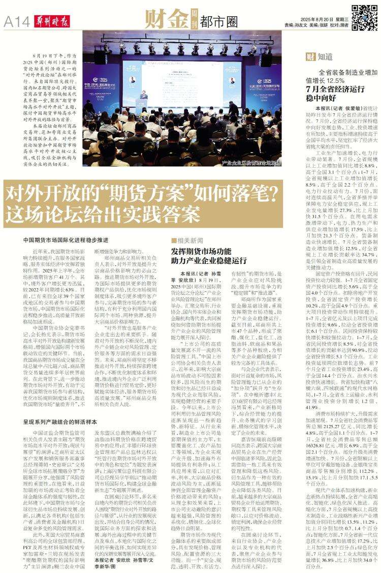 本报讯(记者 孙雪苹 安欣欣) 8月19日,2025中国(郑州)国际期货论坛之分论坛“产业企业风险管理论坛”在郑州举办。汇聚交易所、行业协会、国内外实体企业和金融机构等代表,共同围绕如何借助期货市场提升产业企业的风险管理能力展开深入探讨。