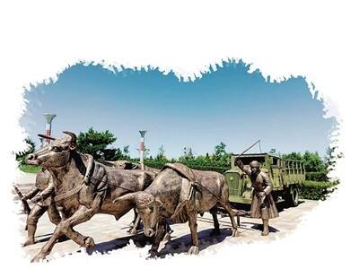 《三牛拉汽车》雕塑铭记着桃力民自卫军奇袭日寇、缴获卡车的故事 本版图片由鄂尔多斯市融媒体中心提供