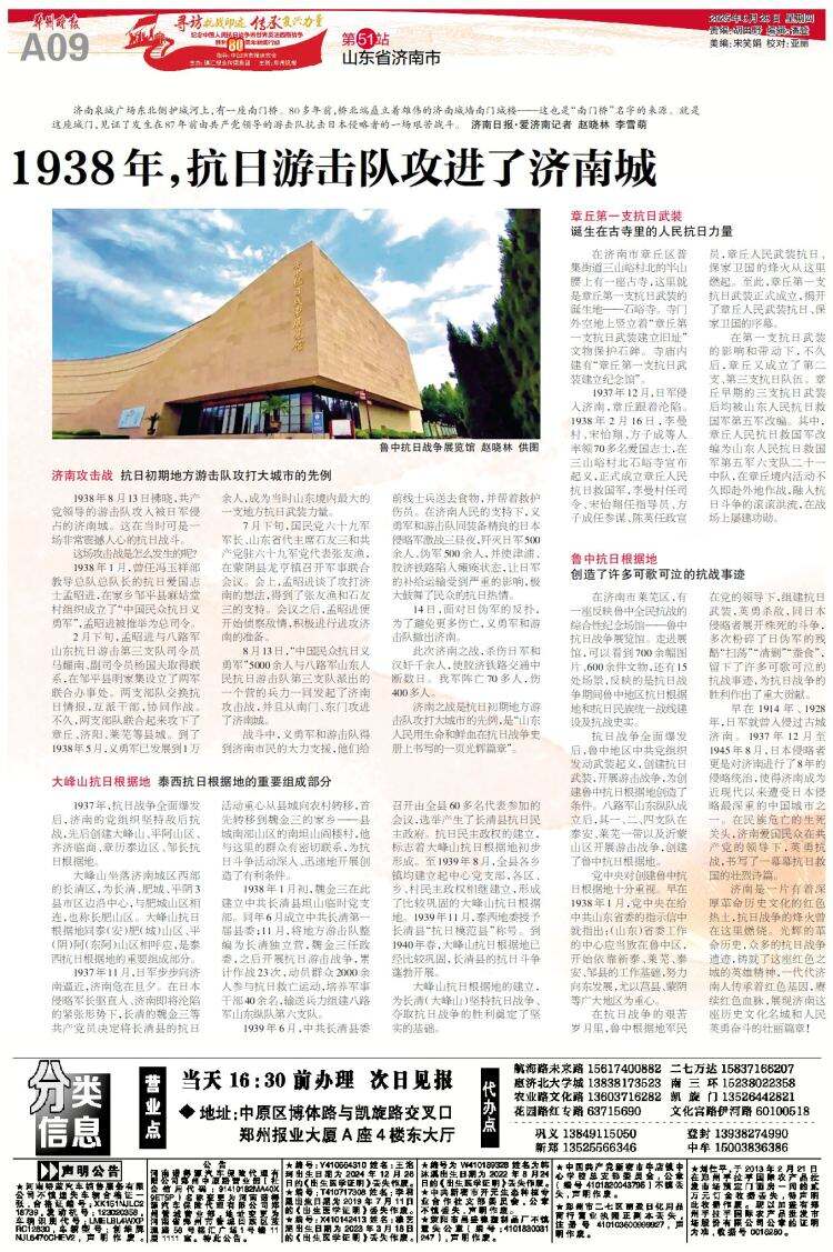 济南是一片有着深厚革命历史文化的红色热土,抗日战争的烽火曾在这里燃烧。光辉的革命历史,众多的抗日战争遗迹,铸就了这座红色之城的英雄精神,一代代济南人传承着红色基因,赓续红色血脉,展现济南这座历史文化名城和人民英勇奋斗的壮丽篇章!