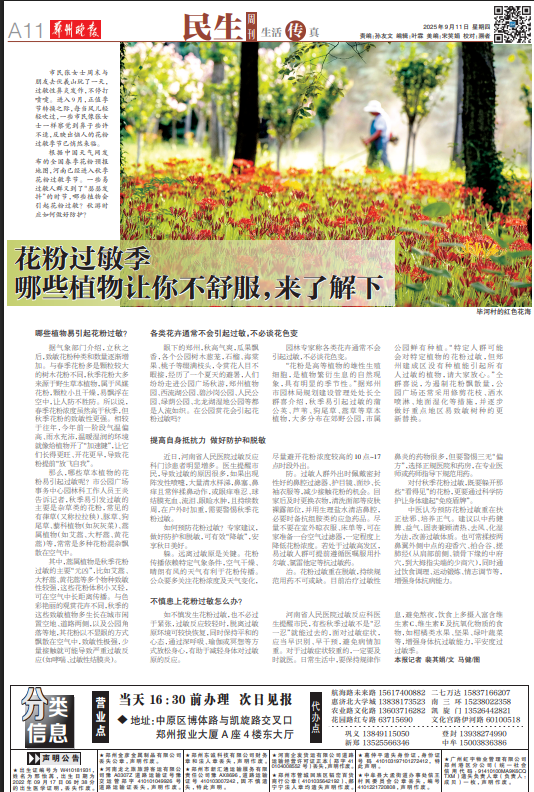 “花粉是高等植物的雄性生殖细胞,是植物繁衍生息的自然现象,具有明显的季节性。”据郑州市园林局规划建设管理处处长仝群喜介绍,秋季易引起过敏的蒲公英、芦苇、狗尾草、蒿草等草本植物,大多分布在郊野公园,市属公园鲜有种植。“特定人群可能会对特定植物的花粉过敏,但郑州建成区没有种植能引起所有人过敏的植物,请大家放心。”仝群喜说,为遏制花粉飘散量,公园广场还常采用修剪花枝、洒水喷淋、地面湿化等措施,并逐步做好重点地区易致敏树种的更新替换。