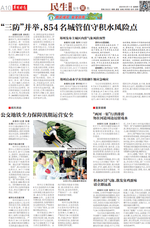 严格执行24小时专人值班和领导带班制度,依托数字城管平台、城市内涝监测预报预警系统等技防手段,对城区415处重点部位雨情、水情实时获取、自动预警,实现科学指挥精准调度,构建城区“一图监测、一屏调度”防汛格局。同时,开展防汛隐患再排查再整治,并加密金水河、东风渠、熊耳河等河道巡查,劝导市民远离河道。截至目前,已累计疏挖排水管网约1700公里,疏挖窨井18.5万座次,疏浚明沟37条57公里。