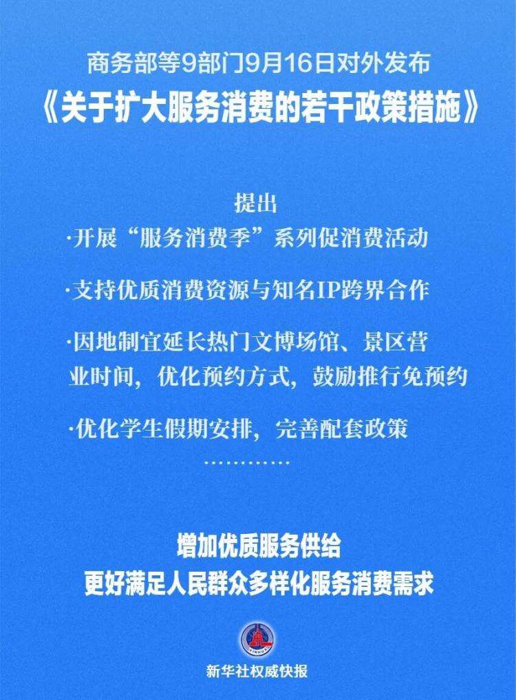 9月16日,商务部等9部门对外发布《关于扩大服务消费的若干政策措施》,提出五方面19条举措。其中优化学生假期安排,完善配套政策中提到,在放假总天数和教学时间总量保持不变的情况下,鼓励有条件的地方结合气候条件、生产安排、职工带薪休假制度落实等因素,科学调整每学年的教学和放假时间,探索设置中小学春秋假,相应缩短寒暑假时间,增加旅游出行等服务消费时间。