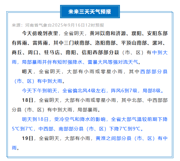 郑州市气象台2025年9月16日17时25分发布大风蓝色预警信号:预计今天夜里到明天白天,郑州市主城区、航空港区、上街区所辖乡镇及街道有4级左右东北风,阵风6~7级。请注意防范大风天气带来的不利影响。