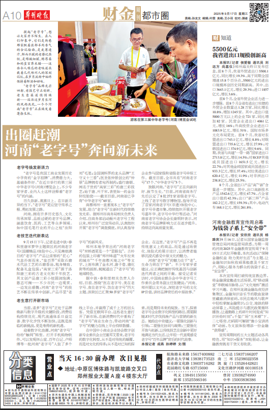 放眼河南,“老字号”正在向新向好、拔节生长。“目前,河南省商务厅先后认定了8批272家省级老字号,上线了老字号数字博物馆,指导开设了首家河南老字号(非遗)体验中心、老字号非遗市集,持续组织开展老字号嘉年华、老字号中华行等活动。”河南省老字号协会会长康明轩表示,河南老字号品牌影响力正在逐步提升,持续迈向高质量发展。