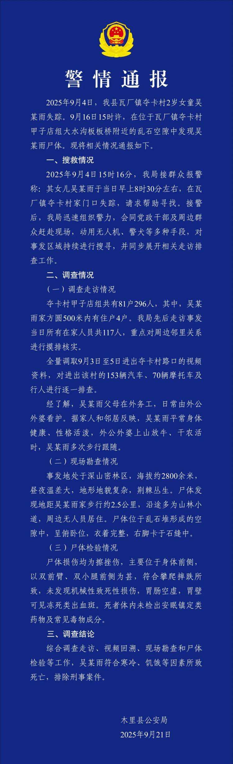 9月21日,四川省凉山木里县公安局通报“四川木里县2岁走失女童遇难”:乱石空隙中发现遗体,符合寒冷、饥饿等因素所致死亡,排除刑事案件。