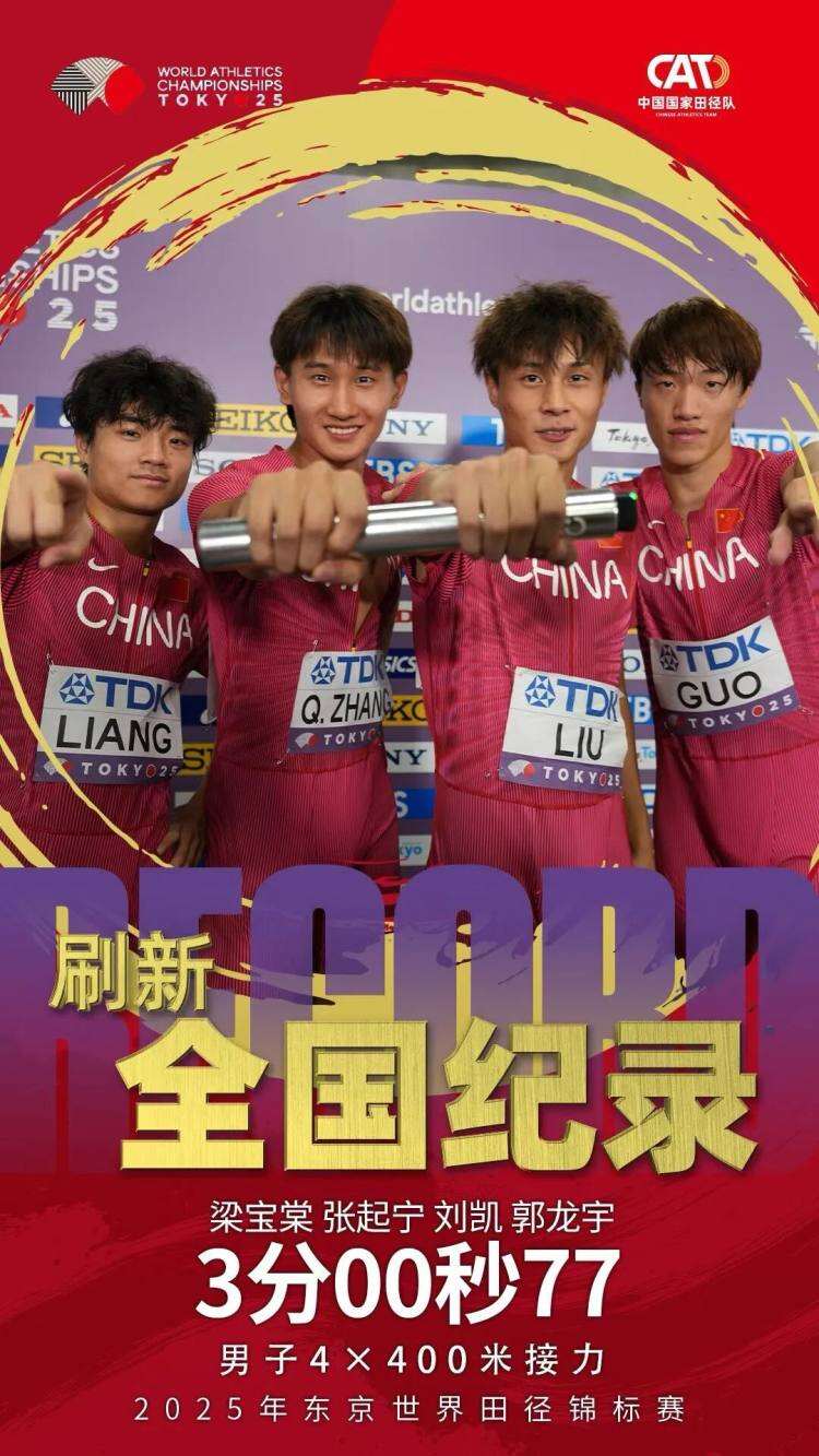 当地时间9月20日晚,在日本东京进行的2025年世界田径锦标赛男子4×400米接力预赛第一组中,由梁宝棠、张起宁、刘凯和郭龙宇组成的中国队以3分00秒77的成绩获得第五名,刷新了此前3分01秒87的全国纪录。
