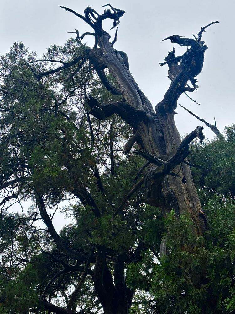 “‘龙柏’曾有部分枝干干枯,生命力看似衰退,但它又从另一侧焕发新枝。”翟老师说。他们为古树定期进行病虫害防治、树体加固和生态复壮。
