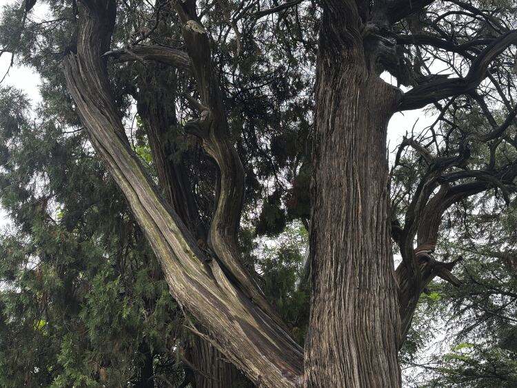 七旬的孙景灿大爷早已在树下等候。细雨打湿了柏树苍劲的枝干,更显墨色深沉。“来看!看那树枝,像不像龙爪?”他声音洪亮,带着不加掩饰的自豪。我们顺着他手指的方向望去,只见东侧古柏的枝干盘曲虬结,冲天而上,确如一条蓄势待发的巨龙,下一刻便要撕开雨幕,腾云九霄。