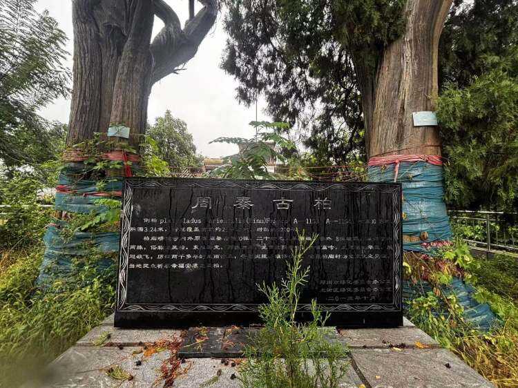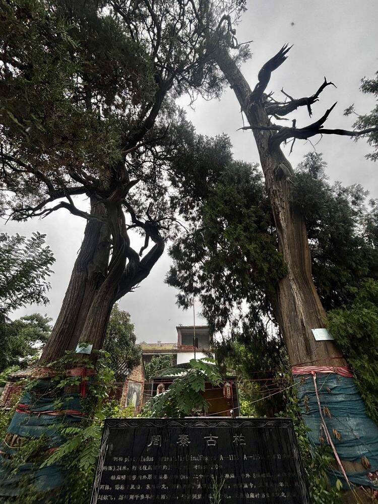 这两棵国家一级古树植于周朝,已历2200余年风雨。东株为“龙”,龙首昂扬,直指苍穹;西株为“凤”,树冠团栾如华盖,似凤尾翩然欲飞。树高约10米,胸围3米,至今枝繁叶茂。它们默默履行着守护这片土地的千年诺言。