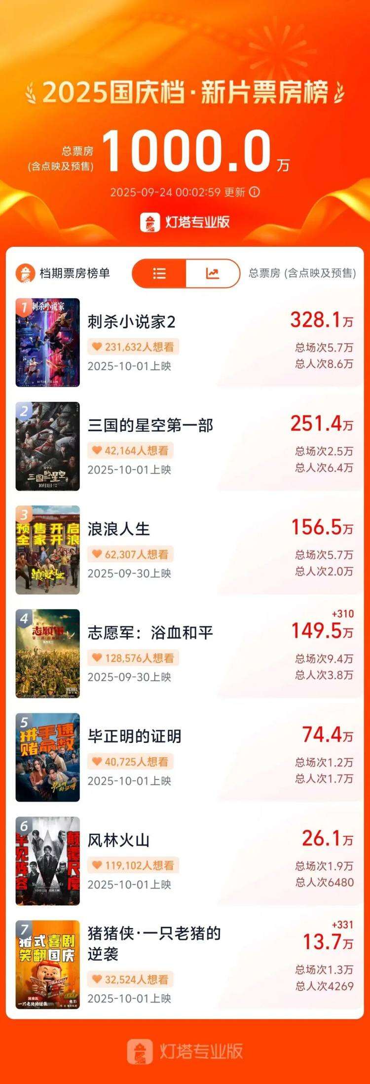 9月23日上午9点,2025国庆档预售正式开启,9月24日,今年国庆档新片预售总票房(含点映)突破1000万,《刺杀小说家2》《三国的星空第一部》《浪浪人生》暂列预售票房榜前三位。