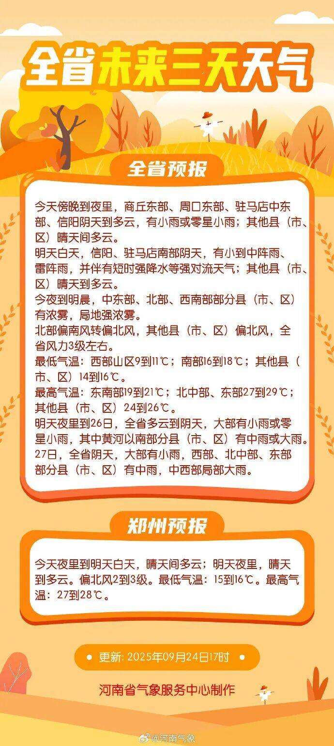 今夜到明天白天,河南多地仍是降水间歇期,要注意明天白天,驻马店南部和信阳地区有小到中阵雨、雷阵雨,并伴有短时强降水等强对流天气。今夜到明晨,中东部、北部、西南部部分县市有浓雾,局地强浓雾,驾车出行要提高警惕!明晚开始,我省阴雨天气又将上线。