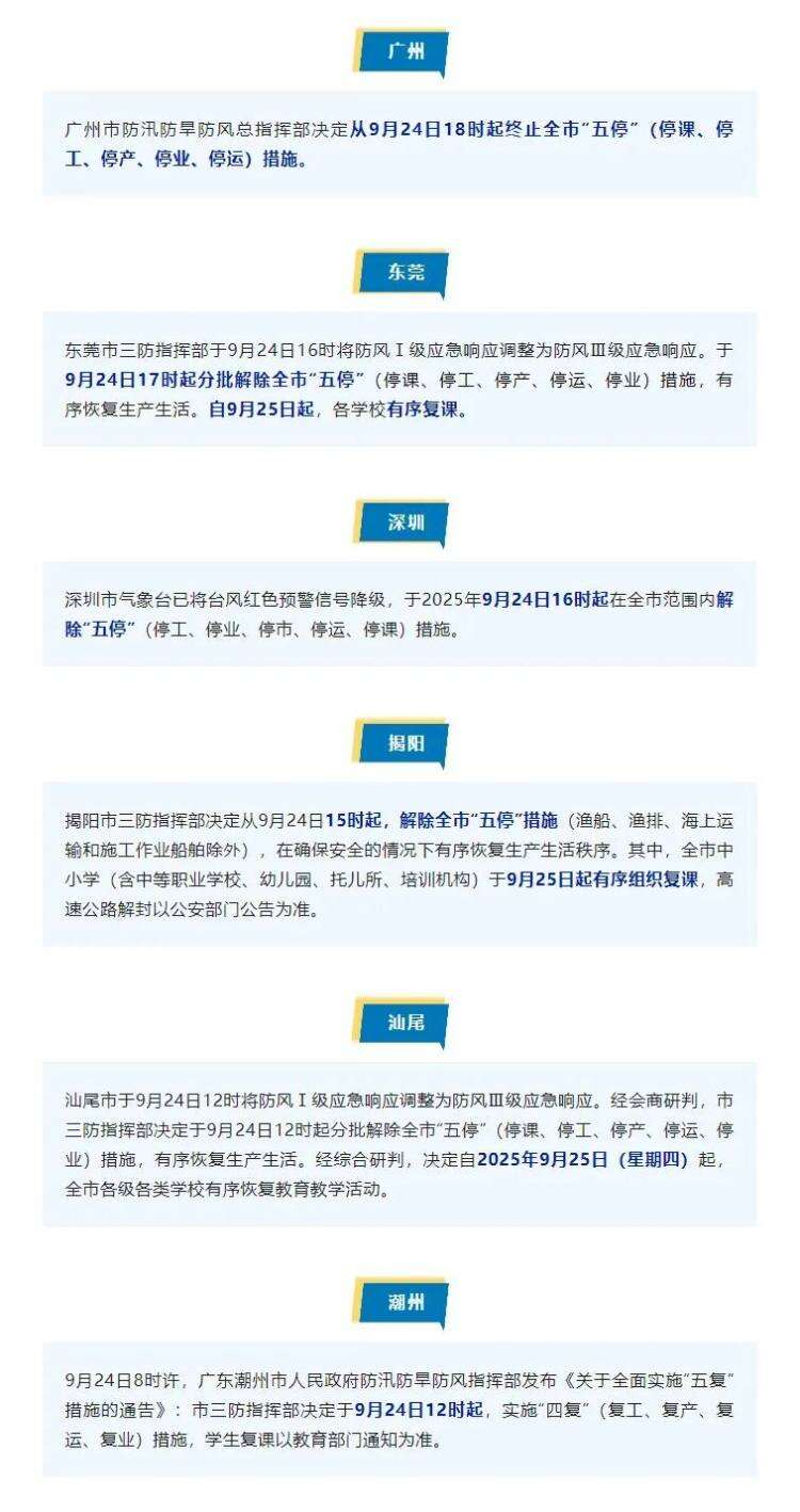 随着台风“桦加沙”西进,广州、深圳、东莞等多个城市陆续解除“五停”。