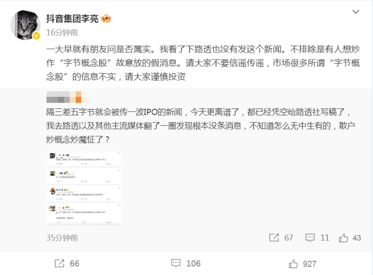 9月25日,针对日前市场传闻称字节跳动将在港股上市,抖音集团副总裁李亮在微博发文辟谣。