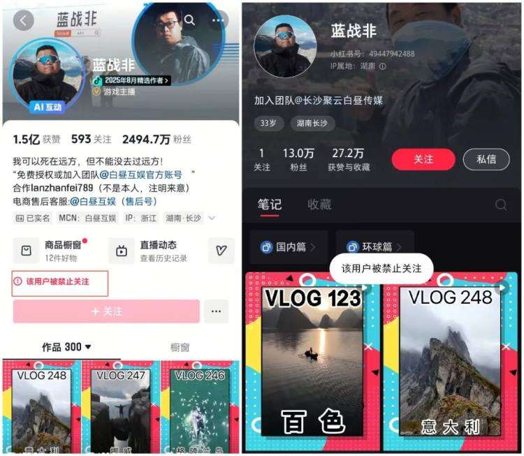 9月25日,千万粉丝博主蓝战非抖音、小红书账号被禁止关注。截至目前,其抖音粉丝近2500万。此前他称若全力投入商业化运作,年收入可达九位数引发争议。第三方数据显示,其1S-20S、21S-60S、60S以上视频广告报价均为150万。
