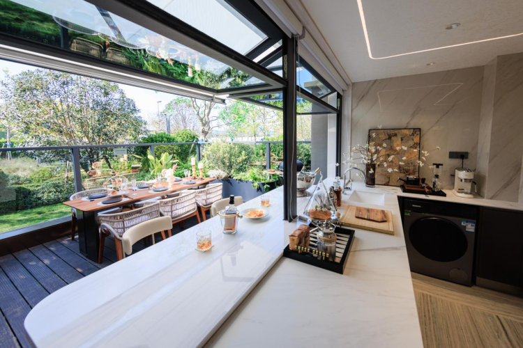 基于此视野,LDKBG设计更实现了功能的完美联动:从厨房到客厅,再到延伸而出的露台,整个空间成为一体化的社交舞台。无论是备餐时与家人的闲聊,还是在露台上小酌远眺,家庭互动与自然光影始终自由交融,呈现出全景、全情、全时的沉浸式居住体验。