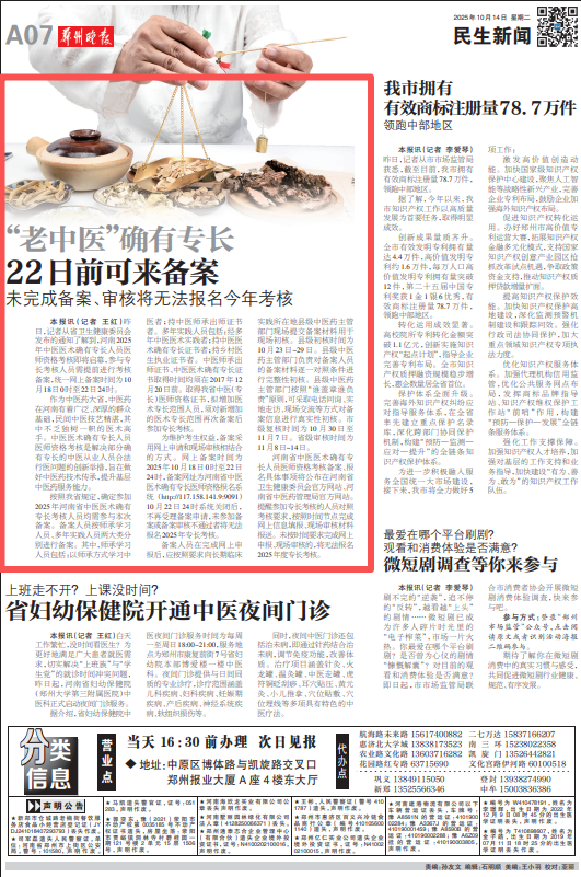 昨日,记者从省卫生健康委员会发布的通知了解到,河南2025年中医医术确有专长人员医师资格考核即将启幕,参与专长考核人员需提前进行考核备案,统一网上备案时间为10月18日0时至22日24时。