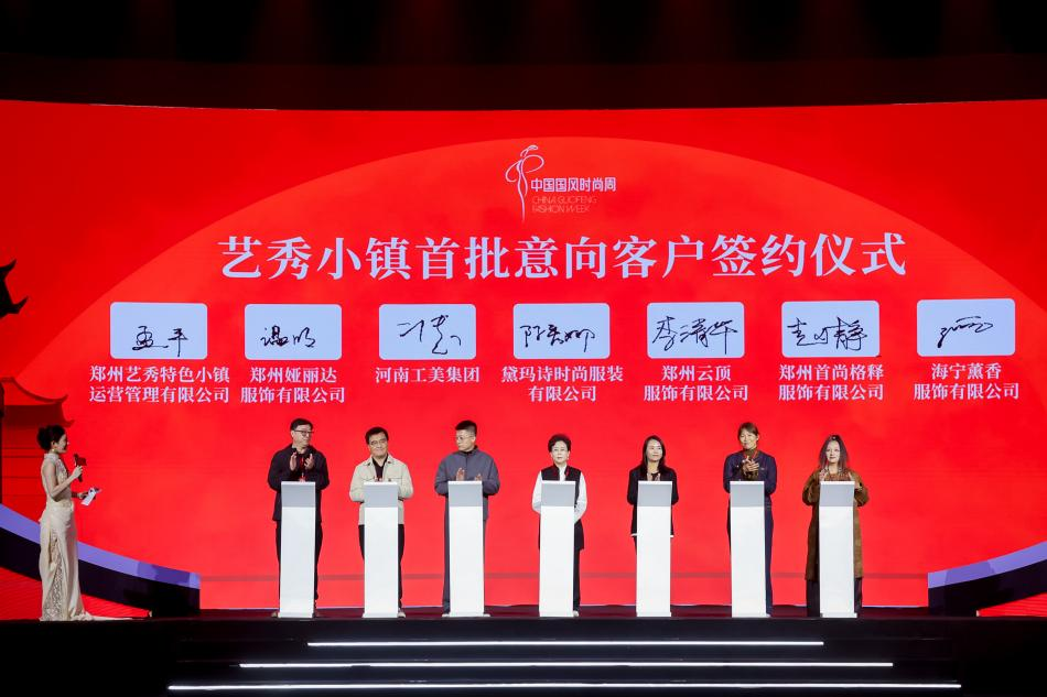 随后举行的艺秀小镇首批意向客户签约仪式中,郑州艺秀特色小镇运营管理有限公司、郑州娅丽达服饰有限公司、河南工美集团、黛玛诗时尚服装有限公司、郑州云顶服饰有限公司、郑州首尚格释服饰有限公司、海宁薰香服饰有限公司代表上台,共同见证了“穿国风,到艺秀”从愿景走向现实的关键一步。这些企业的入驻将为国风产业生态注入新的活力。