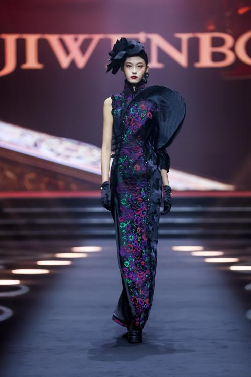 在一场美轮美奂的国风舞蹈表演后,开幕大秀将活动推向高潮。“金顶奖”设计师计文波以其同名国际品牌JIWENBO,呈现了一场融合传统与现代的视觉盛宴。大秀服装通过缂丝刺绣与数码印花的交融、汉服宽袖与西式剪裁的结合,生动诠释了“衣以载道”的当代价值。