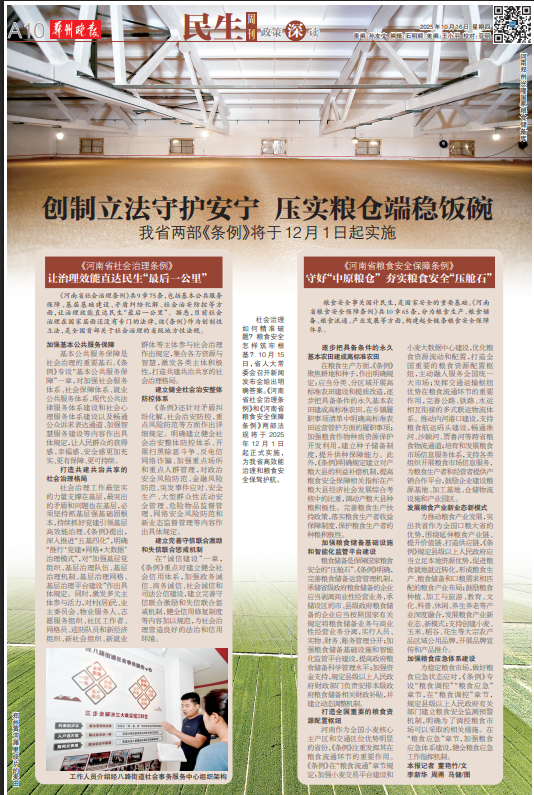 社会治理如何精准破题?粮食安全怎样筑牢根基?10月15日,省人大常委会召开新闻发布会给出明确答案。《河南省社会治理条例》和《河南省粮食安全保障条例》两部法规将于2025年12月1日起正式实施,为我省高效能治理和粮食安全保驾护航。