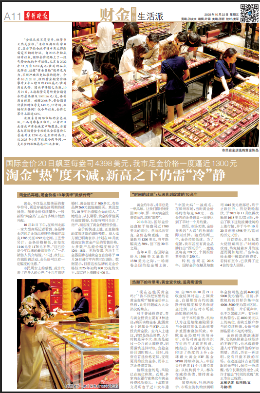 这股来自国际市场的金色旋风,已迅速席卷至郑州。记者近日走访我市黄金珠宝市场获悉,当前各大商场黄金专柜的足金零售价已普遍升至1290元/克左右的高位。从2023年9月下旬至今两年间,一克足金的涨幅高达670元左右。