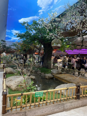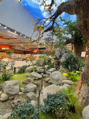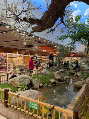 推开超市大门,2000平方米的空间整洁明亮,暖黄色的灯光洒在货架上,让人倍感舒适。而最让人眼前一亮的,当属门店核心动线上那片110平方米的“公园景观区”。翠绿的绿植错落有致地分布着,人工瀑布顺着岩石潺潺流下,溅起细碎的水花,一条小溪绕着假山蜿蜒,几只憨态可掬的鸭子在水里扑腾嬉戏,头顶的晴空幕布仿佛把蓝天搬进了超市,不少市民停下脚步,掏出手机拍照打卡,定格这份意外的惬意。
