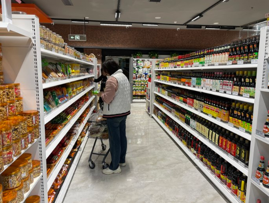 除了颜值与实力并存的生鲜区,超市里还整齐排列着十几个区域:烘焙区飘着面包的香甜,熟食区的卤味让人垂涎,日用品区品类齐全,速食区、饮品区满足各种需求,真正实现了“一站式购物”。更贴心的是,服务台旁放着柔软的休息沙发,旁边的医疗箱里备着常用药品,充电设施随时可供使用;店内不仅有干净的卫生间,还设置了直饮水设备,每一个细节都透着对顾客的用心。