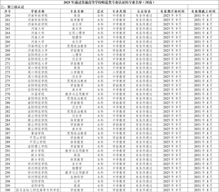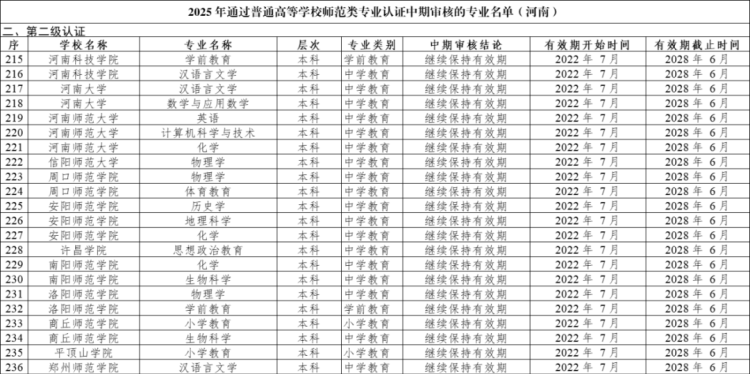 近日,教育部办公厅发布《关于公布2025年通过普通高等学校师范类专业认证专业名单及中期审核专业名单的通知》。据统计,2025年共有287所高校通过师范类专业认证和中期审核,其中河南19所高校41个专业通过师范类专业认证、13所高校22个专业通过师范类专业认证中期审核。