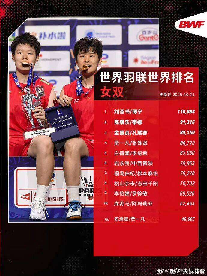 世界羽联2025年第43周世界排名揭晓,中国队强势包揽三项世界第一:石宇奇(男单)、刘圣书/谭宁(女双)、蒋振邦/魏雅欣(混双)均以10万+高分继续领跑各单项第一。