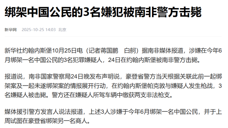 涉嫌在今年6月绑架一名中国公民的3名犯罪嫌疑人,24日在约翰内斯堡被南非警方击毙。详情披露:双方发生枪战,嫌疑人上周曾试图绑架另一名商人。
