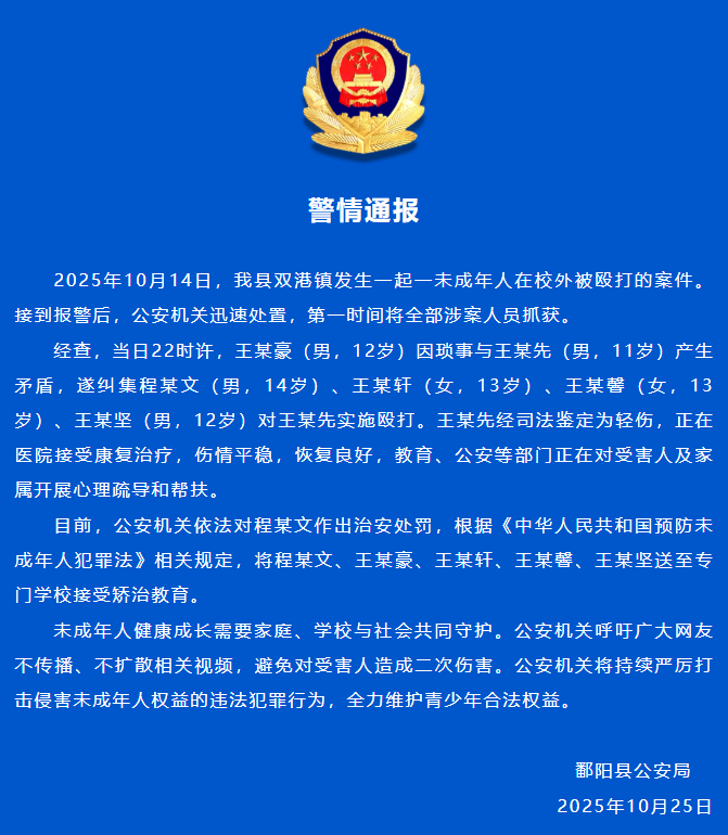 5名未成年人在校外殴打11岁男生,10月25日,江西警方通报:1人被治安处罚,5人接受矫治教育。