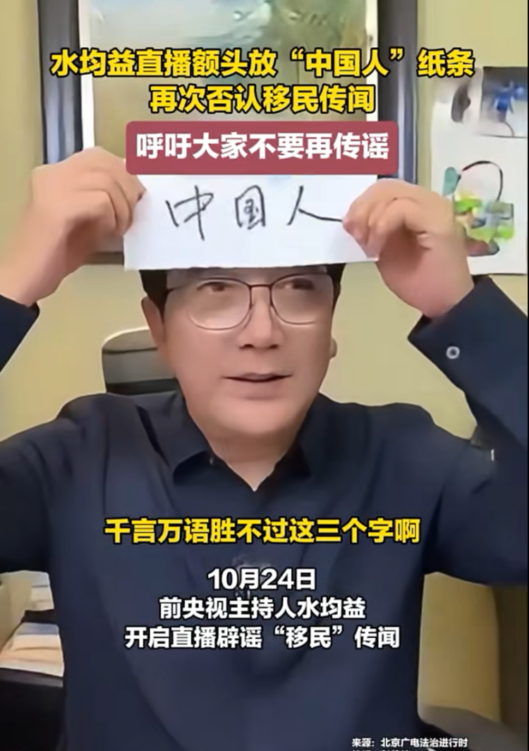 10月24日,前央视主持人水均益在直播时,额头放“中国人”纸条,否认移民传闻:“请大家千万不要再传谣了,我们全家是中国人。”