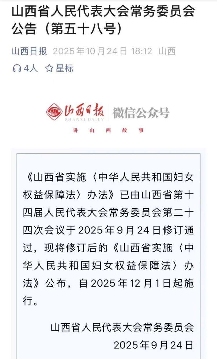 10月24日,山西明确发布:禁止诋毁、侮辱大龄未婚女性,禁止歧视、虐待生育女婴或者残疾婴儿的妇女以及不育妇女;妇女享有与男性平等的继承权。