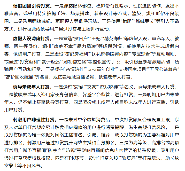 10月28日,中央网信办发布通知,在全国范围内开展为期2个月的“清朗·整治网络直播打赏乱象”专项行动,重点整治以下4类问题: