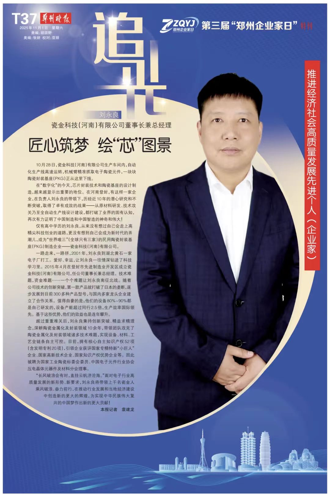刘永良,瓷金科技(河南)有限公司董事长兼总经理,长期致力于芯片封装技术和陶瓷基座的设计制造,带领团队攻克了陶瓷金属化及封装领域诸多技术难题,实现设备、材料、工艺全链条自主可控。目前,拥有核心自主知识产权52项(含发明专利20项),引领企业获评国家专精特新“小巨人”企业、国家高新技术企业、国家知识产权优势企业等。