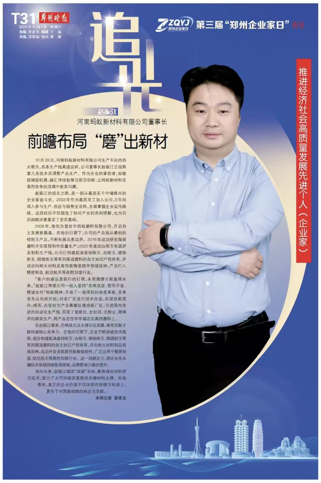 赵振江,河南蚂蚁新材料有限公司董事长。专注于新型功能材料的研发与市场开拓。他坚持以市场需求为导向,强化产学研协同创新,带领企业快速成长为国家级专精特新“小巨人”企业,其主导开发的系列产品在国内外市场广受认可,彰显了中原民营企业在全球竞争中的崛起之势。