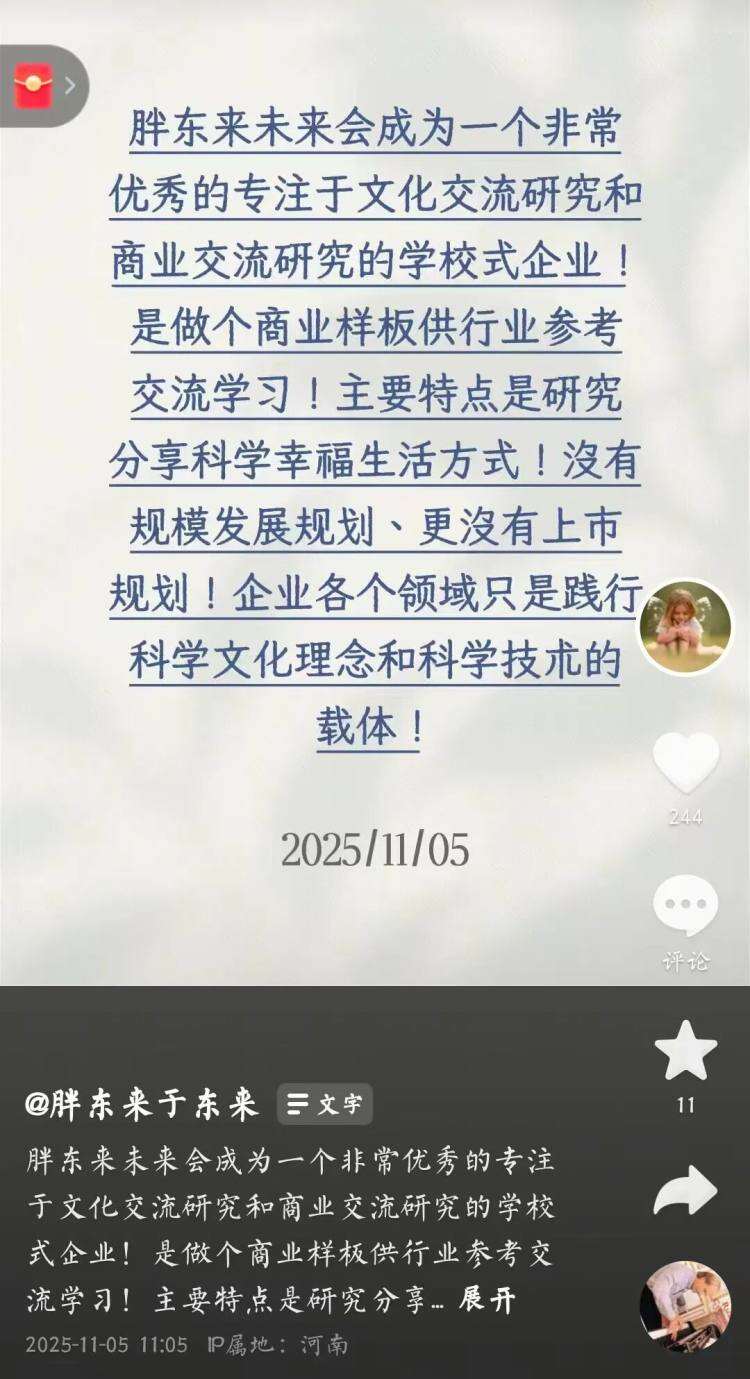 11月5日,于东来在社交平台发布图文称,胖东来没有规模发展规划、更没有上市规划。于东来称,胖东来未来会成为一个专注于文化交流研究和商业交流研究的学校式企业,做个商业样板供行业参考交流学习。
