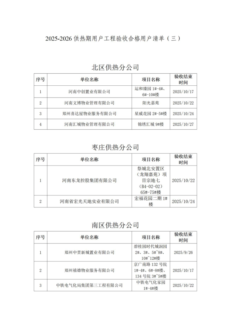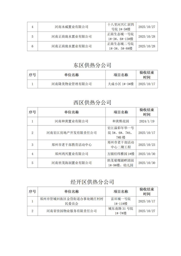 11月5日,郑州热力公司公示第三批供热工程验收名单,共有用热项目20个,报装用热建筑面积153.5万平方米,各项供热工程验收合格,符合供热技术规范和使用要求,现予公示↓↓↓