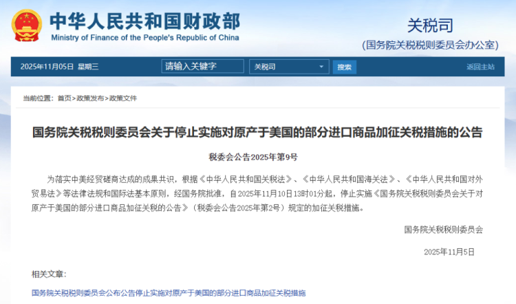 11月5日,国务院关税税则委员会发布关于调整对原产于美国的进口商品加征关税措施的公告:在一年内继续暂停实施24%的对美加征关税税率,保留10%的对美加征关税税率。