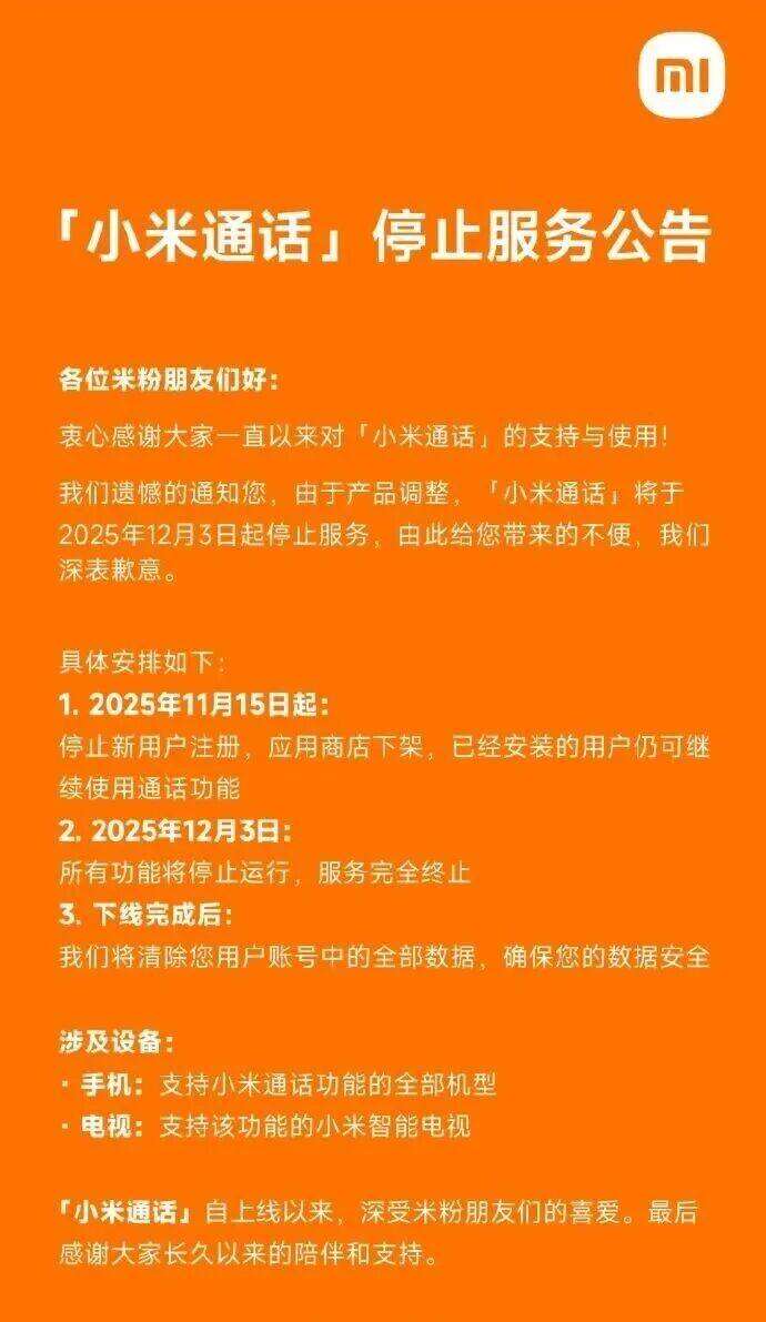小米通话发布公告称,将于2025年12月3日停止服务。公告称,由于产品调整,小米通话将于2025年12月3日起停止服务。