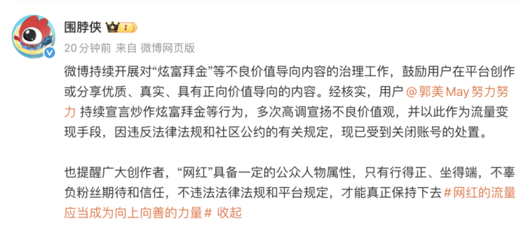 11月6日,“初代网红”郭美美因持续炒作炫富拜金等不良价值观,其复出账号再次被微博官方封禁。曾两次获刑:销售有毒、有害食品罪以及开设赌场罪。