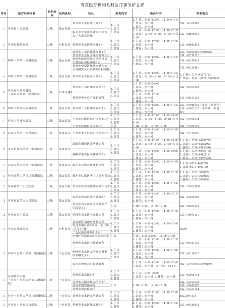11月5日,河南省卫生健康委员会公布了了全省提供儿童门诊服务的基层医疗卫生机构名单以及19家省直医疗机构儿科医疗服务信息。具体来说,全省提供儿童门诊服务的基层医疗卫生机构名单汇集在此,内容包括各医疗机构名称、地址、电话、服务科室、服务对象、服务项目和服务时间等。(查询网址为:https://wsjkw.henan.gov.cn/2025/10-31/3240540.html)