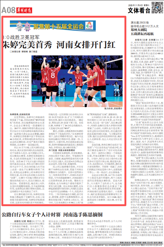 有朱婷助阵的河南女排果然不同凡响。11月7日晚上,在澳门威尼斯人综艺馆举行的第十五届全运会女排项目的小组第一轮比赛中,河南队3∶0击败了卫冕冠军天津队,向小组出线迈出了坚实的一步,也送给河南球迷一个巨大的惊喜。