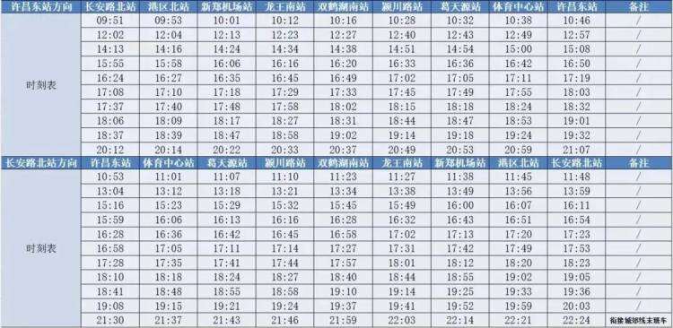 自11月8日起,郑许线将在正常运营的基础上,在周末期间试行大站快车模式,助力出行再“加速”。大站快车全日共开行21列次,仅停靠长安路北站、港区北站、新郑机场站、龙王南站、双鹤湖南站、颍川路站、葛天源站、体育中心站、许昌东站,其余站点均不停靠单程运行时间55分钟,较慢车缩短20分钟,详细时刻表如下:
