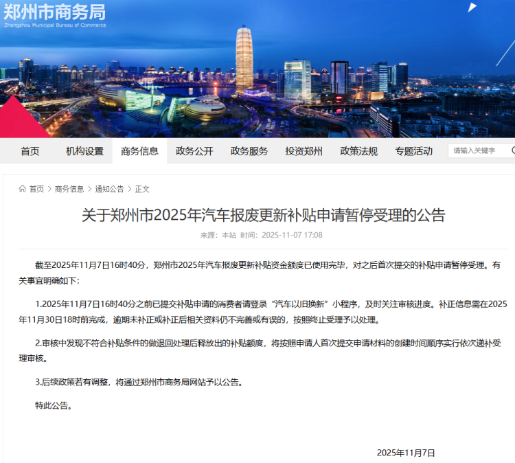 11月7日,郑州市商务局发布公告:2025年汽车报废更新补贴资金额度已在当日16时40分全部使用完毕,此后首次提交的补贴申请将暂停受理。