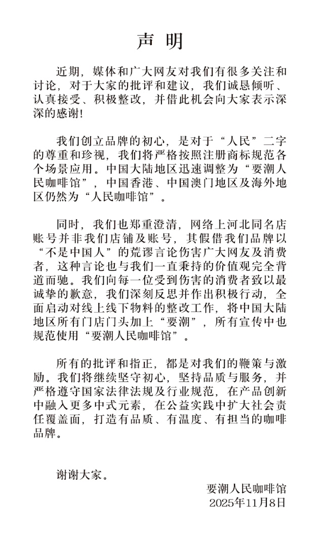 近日,全国多地出现了以“人民咖啡馆”为店标、且装修高度相似的店家,引发争议。11月8日,要潮人民咖啡馆致歉:将严格按照注册商标规范各个场景应用,将中国大陆地区所有门店门头加上“要潮”,所有宣传中也规范使用“要潮人民咖啡馆”。