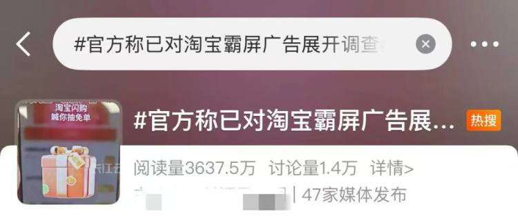 11月8日,“官方称已对淘宝霸屏广告展开调查”冲上微博热搜。近日,有用户反映,打开多款手机App时,手指触碰或机身晃动即被强制跳转至淘宝会场,严重影响使用体验。11月6日,针对淘宝“双11”期间霸屏广告乱象,杭州市余杭区市场监督管理局证实已收到相关举报,目前已交由网监分局展开调查。